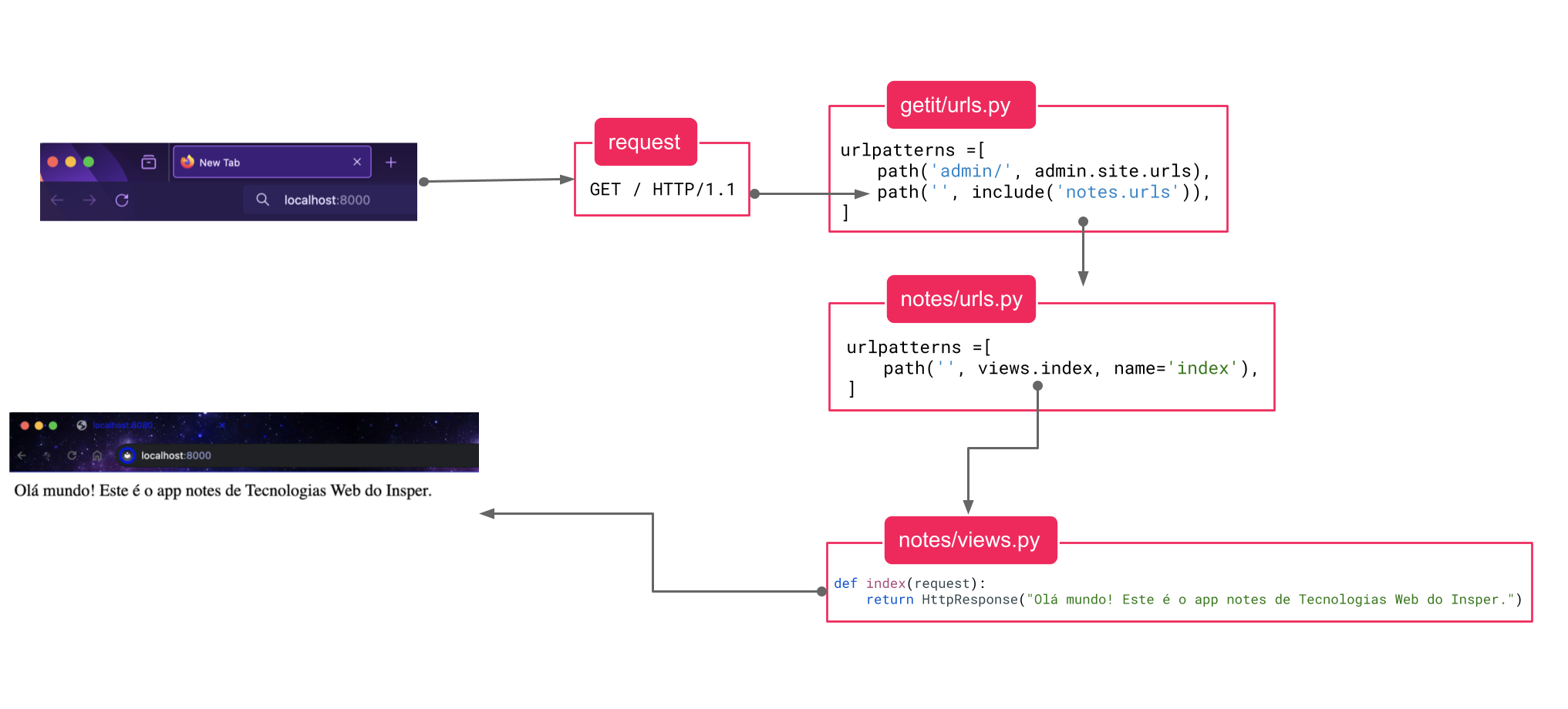 Nossa primeira tarefa será fazer um hello world usando o Django. Queremos que, ao acessar a página http://localhost:8000 o usuário veja o texto "Olá mundo! Este é o app notes de Tecnologias Web do Insper." na tela do navegador.